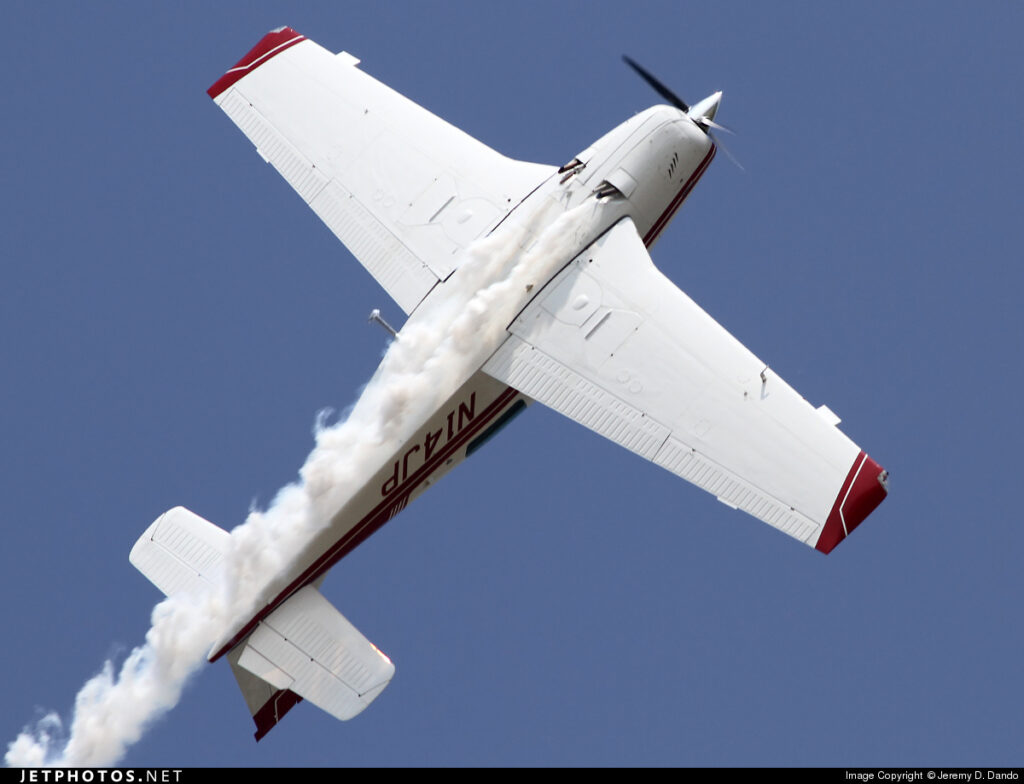 O N14JP, praticamente invertido, durante Oshkosh 2014. Foto: https://www.jetphotos.com/photo/7890833