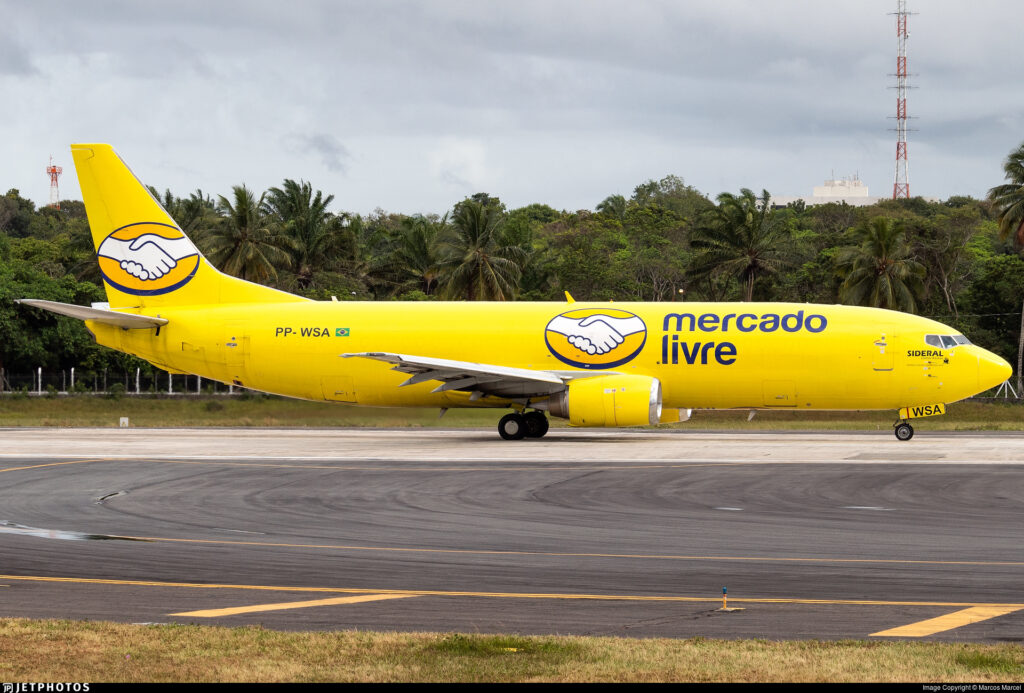 O Boeing 737-400 PP-WSA, foi, de fato, a primeira aeronave a operar no Brasil com as cores “full” do Mercado Livre. A mesma pertence à Sideral Linhas Aéreas e foi fabricada em 1994, para o transporte de passageiros, sendo convertida para o padrão atual em 2013, vindo para cá, em 2014. Foto: https://www.jetphotos.com/