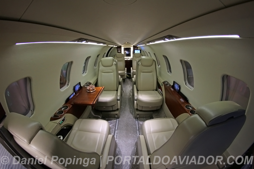 Lembrando que, em aviação executiva, a configuração do interior da aeronave é oferecida de acordo com os gostos e preferências do cliente, podendo variar de um avião para outro.