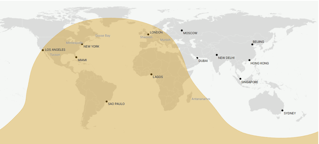 Partindo de São Paulo, o mapa acima mostra as possibilidades de alcance, do Bombardier Global 5500. Imagem: https://bombardier.com/