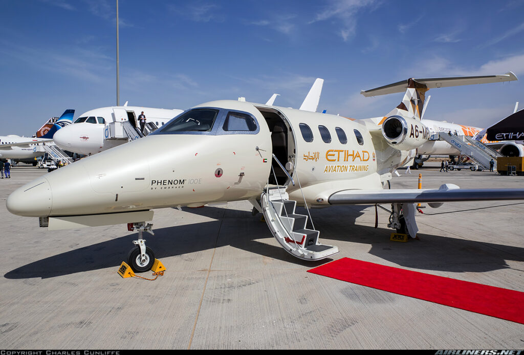 Embraer Phenom 100E A6-MPL (S/N 50000374, de 2017), da Etihad Flight College. Foto: https://www.airliners.net/