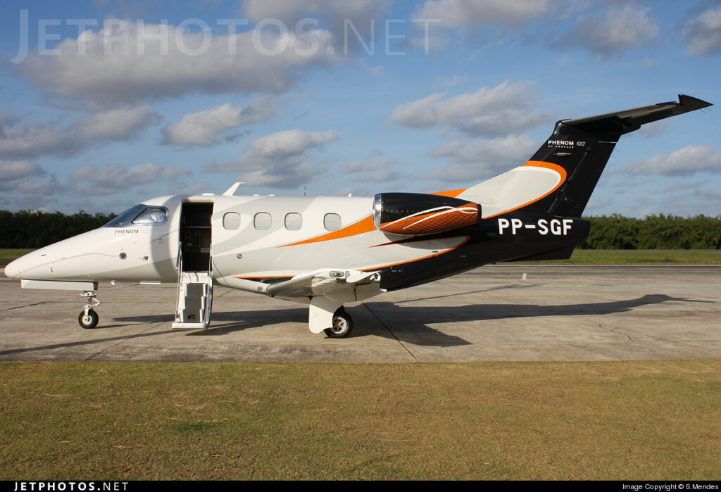 O PP-SGF (S/N 50000005, de 2009) – primeiro Phenom 100 de série, entregue, continua voando no Brasil. Foto: https://www.jetphotos.com/
