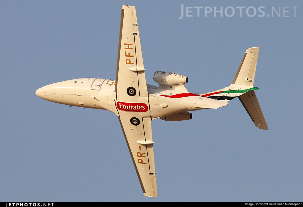 Belíssima imagem do Phenom 100, que apesar de estar ostentando matrícula brasileira, nas cores da Emirates! Foto: https://www.jetphotos.com/
