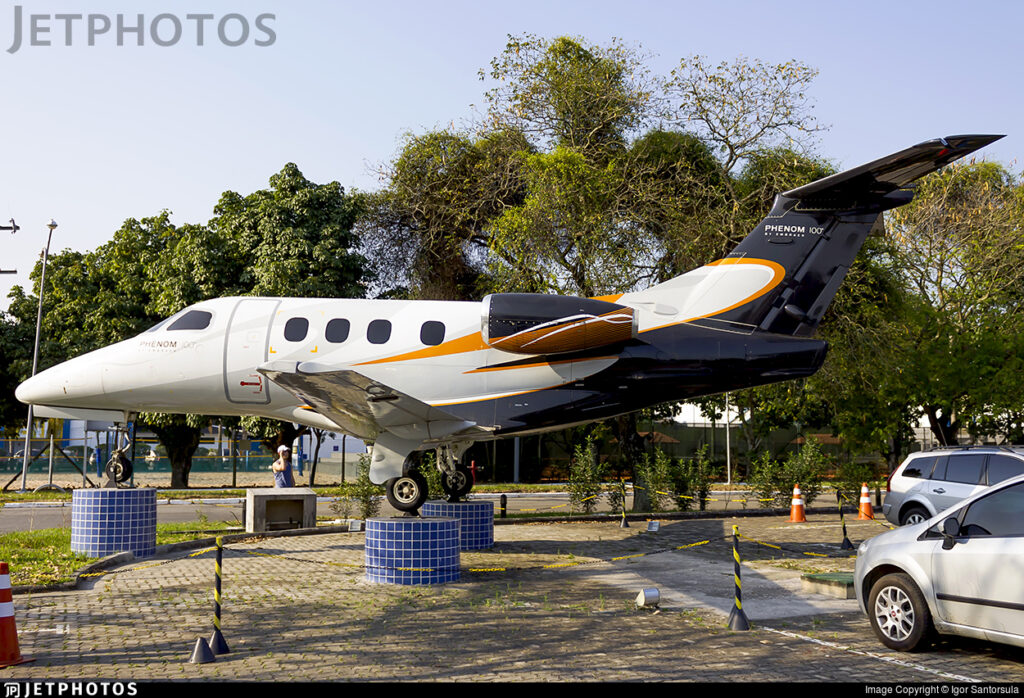 Um fato bastante curioso é que o primeiro Phenom 100, o PP-XPH, encontra-se preservado numa praça pública, em Jacarepaguá, no Rio de Janeiro. Foto: https://www.jetphotos.com/