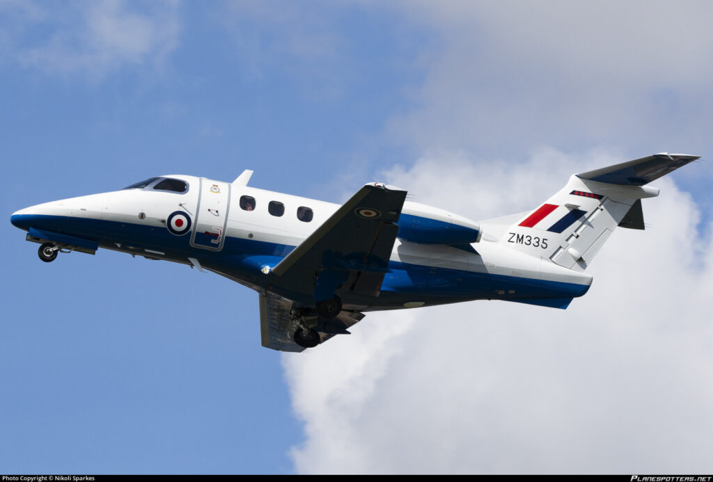 Embraer Phenom 100 da Royal Air Force – RAF, matrícula ZM335 (S/N 50000380), que voou originalmente como N713TE e após, G-CJXJ, pelo UK Ministry of Defence’s Military Flying Training System – UKMFTS. Foto: https://www.planespotters.net/